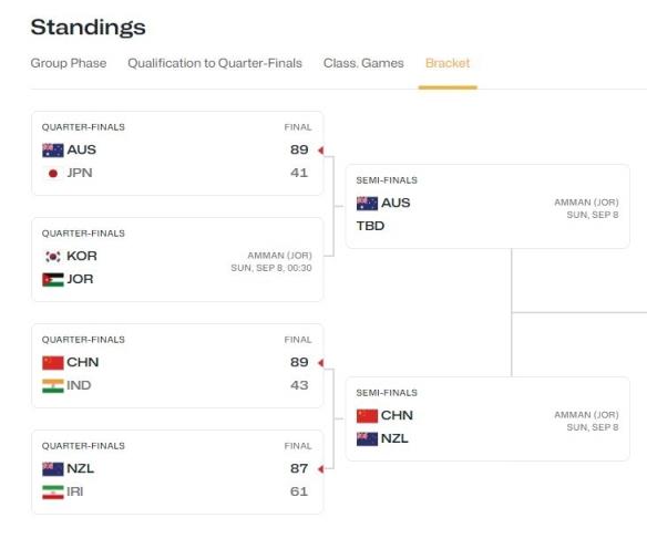 中国队在半决赛的对手将是新西兰队,后者在1/4决赛以87-61战胜伊朗队。目前四强的队伍已经确定三席,分别是中国队、新西兰队和澳大利亚队,剩余的一个四强席位将在韩国队和约旦队之间产生。