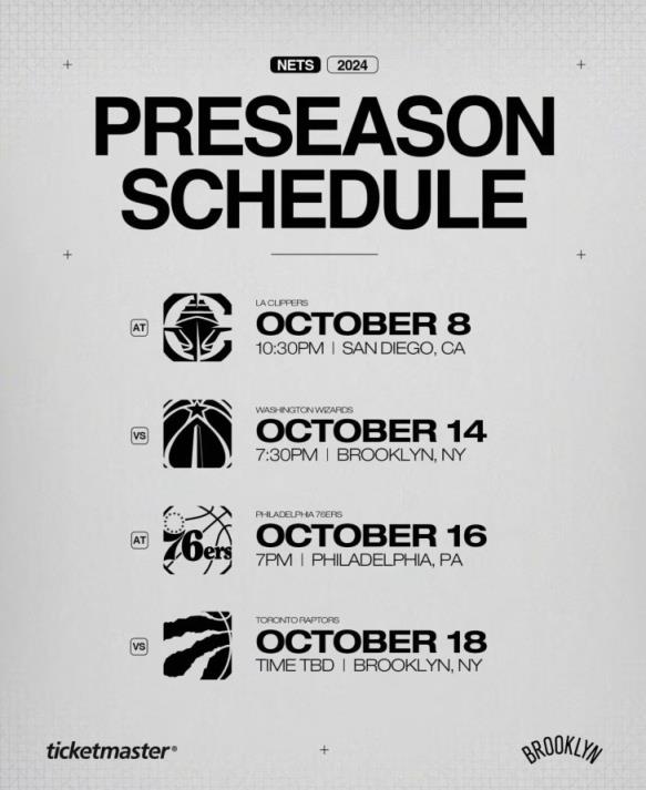 根据此前篮网公布的季前赛赛程,球队要先后对阵快船、奇才、76人和猛龙。