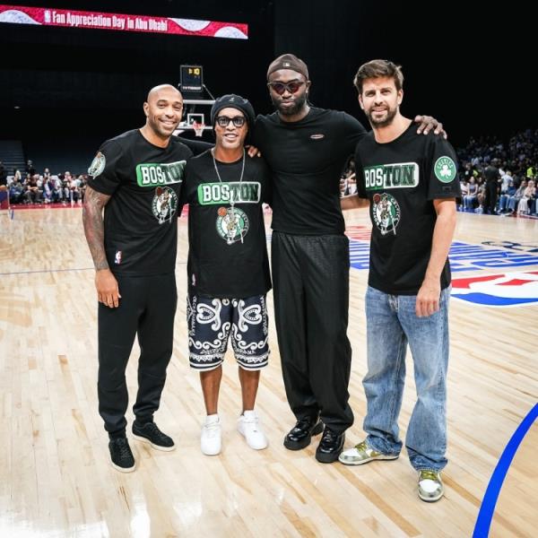 赛后,绿军官方晒出杰伦-布朗与足坛名宿罗纳尔迪尼奥、亨利和皮克的合照。值得一提的是,小罗、亨利和皮克都曾在西甲豪门巴塞罗那队效力。
