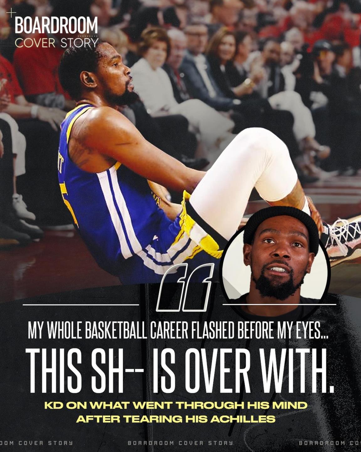 “我倒下之后,我心想我可能再也回不到湾区了。那场比赛大概有2万人在现场吧,我听到了‘嘣’的一声。我心想,完蛋了。我整个篮球生涯在我眼前闪回。一切,一切我曾经做过的事,一切我想过的事情,所有我最爱&最恨的画面,都在那一刻闪回。如果你有看到那个画面,我只是呆坐在那里,无神地望向人群,等待别人把我搀扶起来。那时我心里在想,‘我的生涯就这样结束了。’我当时不知道它有多严重,我只能感觉到极度的紧张和痛苦。”KD说道。
