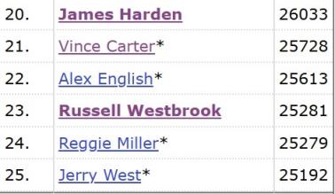 本场比赛过后,威少生涯总得分来到25281分,超越雷吉-米勒,上升至NBA历史第二十三位。