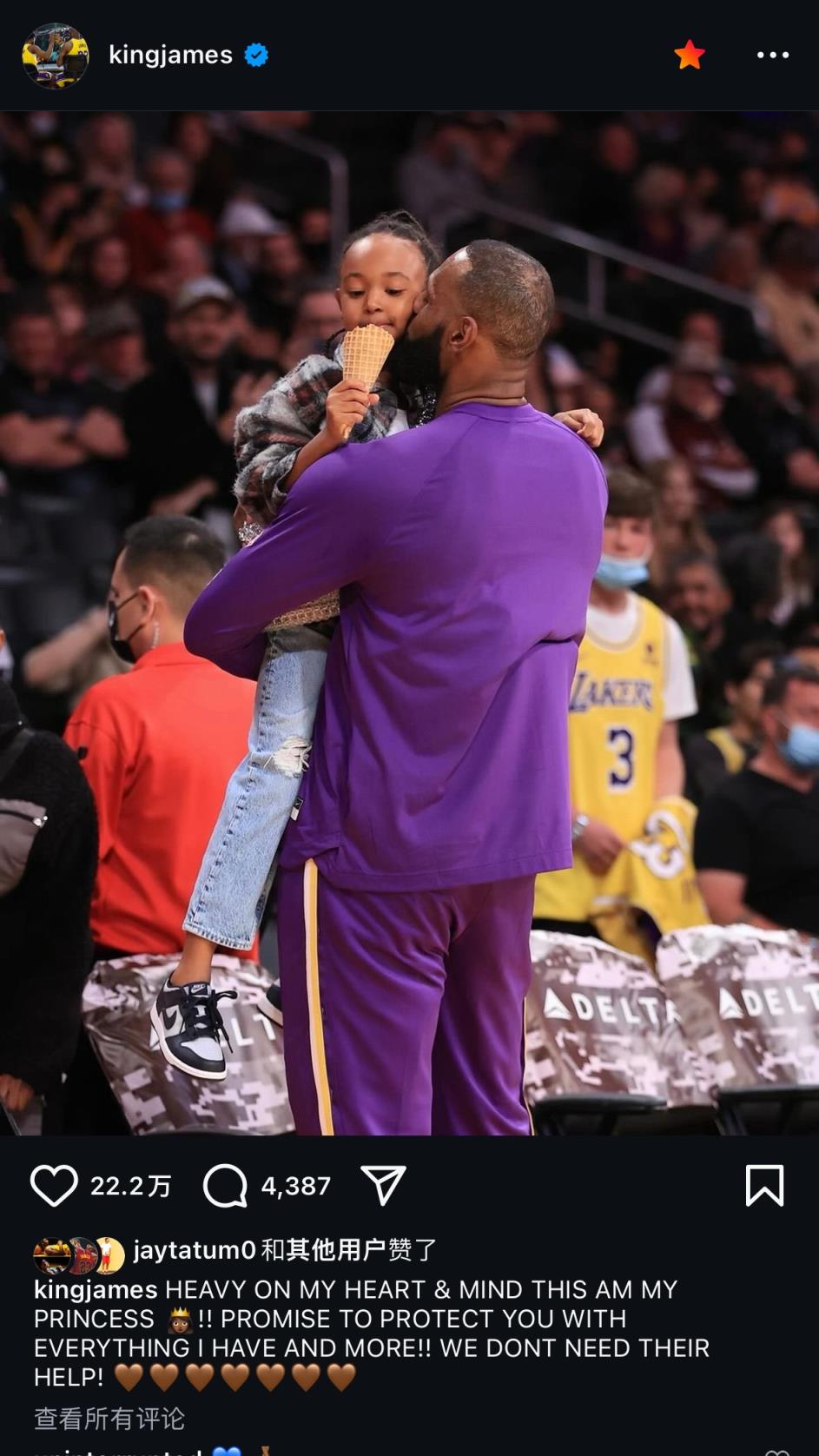 湖人球星詹姆斯更新个人Ins,晒出了自己和女儿朱莉的亲密合照,配文写道:“心情非常沉重&想到了我的公主