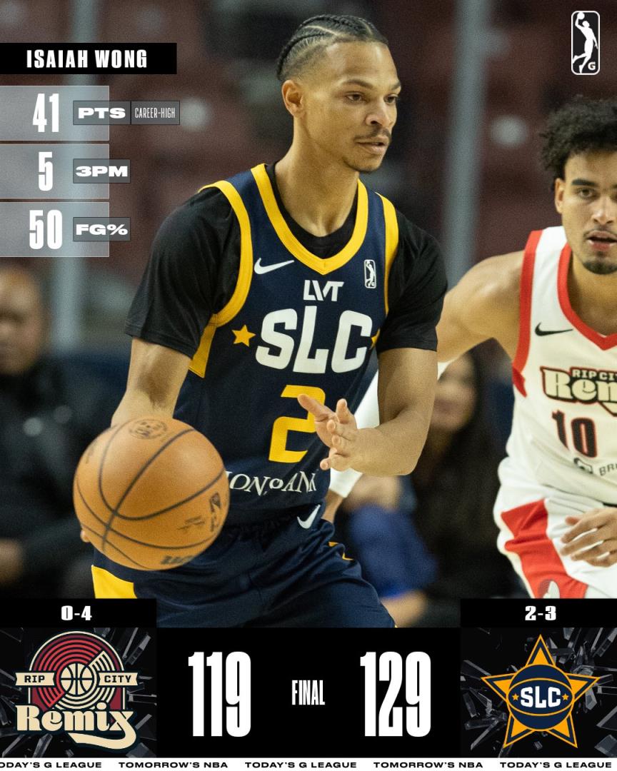 11月22日讯 NBA G联盟常规赛,爵士下属球队盐湖城星光以129-119击败开拓者下属球队撕裂之城混音。