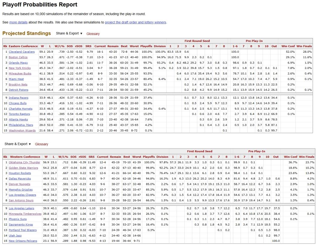 其中,骑士、凯尔特人、雷霆进入季后赛的概率均为100%。魔术、尼克斯、雄鹿、勇士、火箭、独行侠进入季后赛的概率则均超过了90%。除此之外,快船为82.9%,马刺为66.0%,森林狼为26.5%,湖人为26.3%,太阳为17.2%,76人为4.2%。另外,篮网、活塞和黄蜂进入季后赛的概率分别为52.1%、45.2%和34.4%。