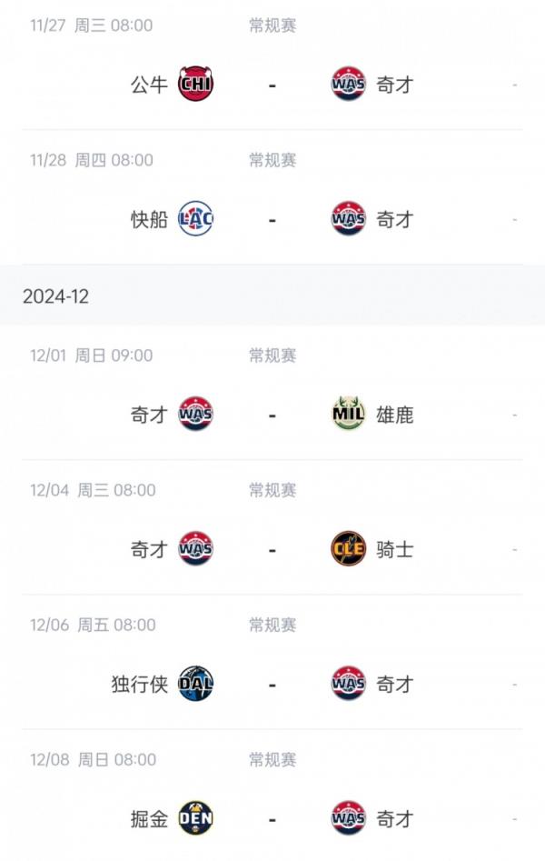 奇才后续的赛程将先后面对公牛、快船、雄鹿、骑士、独行侠和掘金。吧友们认为他们能在这6场比赛中结束连败吗?