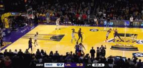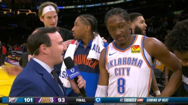 12月1日讯 昨天,NBA杯,雷霆101-93力克湖人。比赛最后20秒,杰伦-威廉姆斯抢断了湖人边线发球,扣篮为球队锁定胜局。