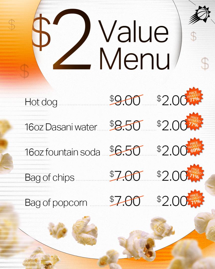 12月20日讯 近日,太阳官方宣布,本赛季剩余主场比赛所供应的食品(热狗、薯条、爆米花)以及饮料(苏打水、矿泉水)统统降价至2美元一份!为所有人提供NBA最实惠、最适合球迷的菜单!