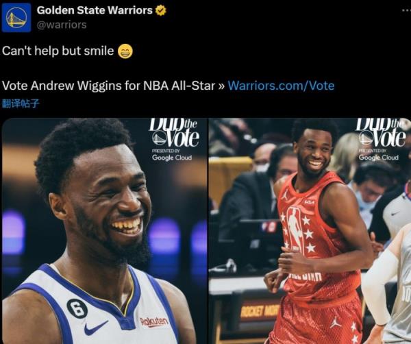勇士官推今天晒出了维金斯温暖纯真的笑容,并为他全明星拉票。勇士官推写道:“情不自禁的笑