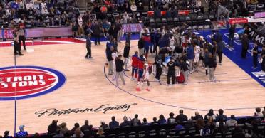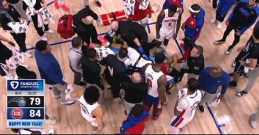 两队球员、工作人员围成一圈,艾维接受活塞队医的治疗