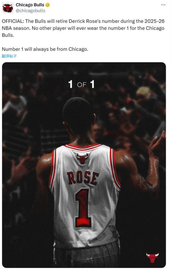 公牛官推官方:公牛将会在2025-26赛季退役德里克-罗斯的球衣,不会再有其他的公牛球员身穿1号球衣,一号(第一名)永远来自芝加哥。