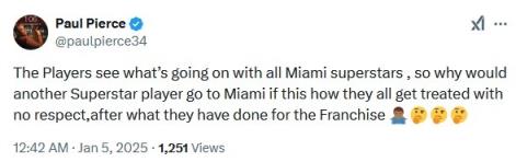NBA名宿皮尔斯更推点评道:“球员们都看看热火的所有超巨都经历了什么?如果他们为球队做了那么多贡献但得不到尊重,那其他超巨还有什么理由去迈阿密呢?”