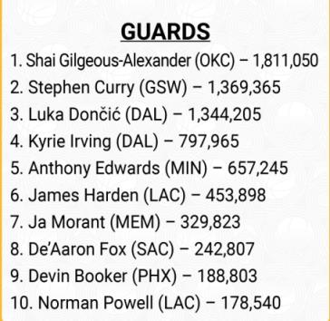 01月10日讯 NBA官方公布了2025年旧金山全明星周末第一阶段球迷投票结果。