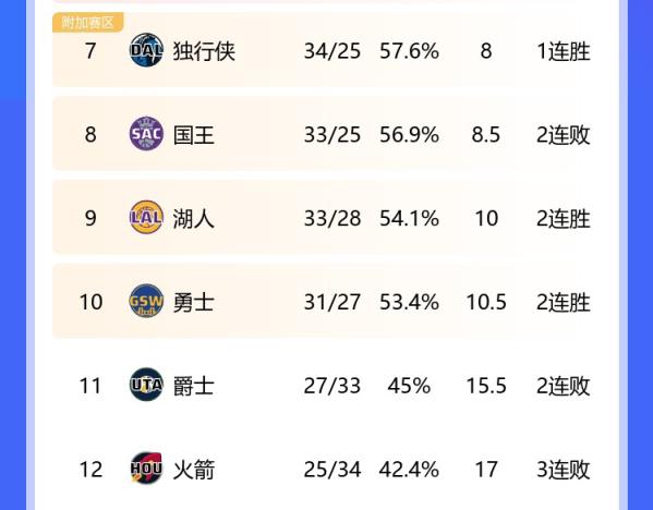 火箭的战绩来到25胜34负,排在西部第12,距离第11的爵士还有1.5个胜场,和第10(附加赛)的勇士相差6.5个胜场。