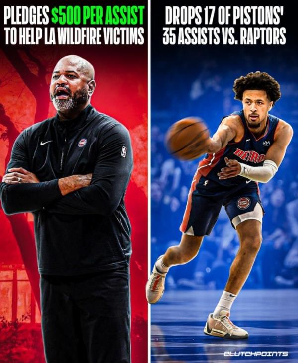 活塞主帅比克斯塔夫将为洛杉矶山火捐款17500美元(球队每送出一次助攻、他捐500美元),康宁汉姆则捐8500美元(自己每送出一次助攻、捐500美元)。