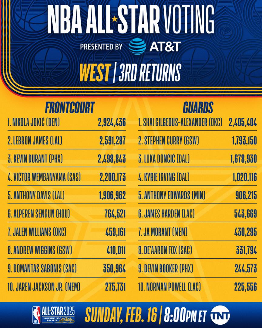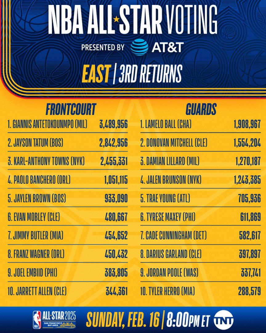 01月17日讯 NBA官方公布了2025年旧金山全明星周末第三阶段球迷投票结果,字母哥继续票王,约基奇继续领跑西部,西部前场前三约基奇、詹姆斯、杜兰特,文班第四,西部后场亚历山大继续领跑,库里第二,东契奇第三,东部后场拉梅洛-鲍尔继续领跑,随后是米切尔与利拉德。东部前场前三为字母哥、塔图姆、唐斯。