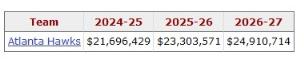 亨特本赛季至今为老鹰出战36场比赛,场均18.9分3.8篮板1.4助攻。他的合同将在2026-27赛季到期,具体薪资情况如下: