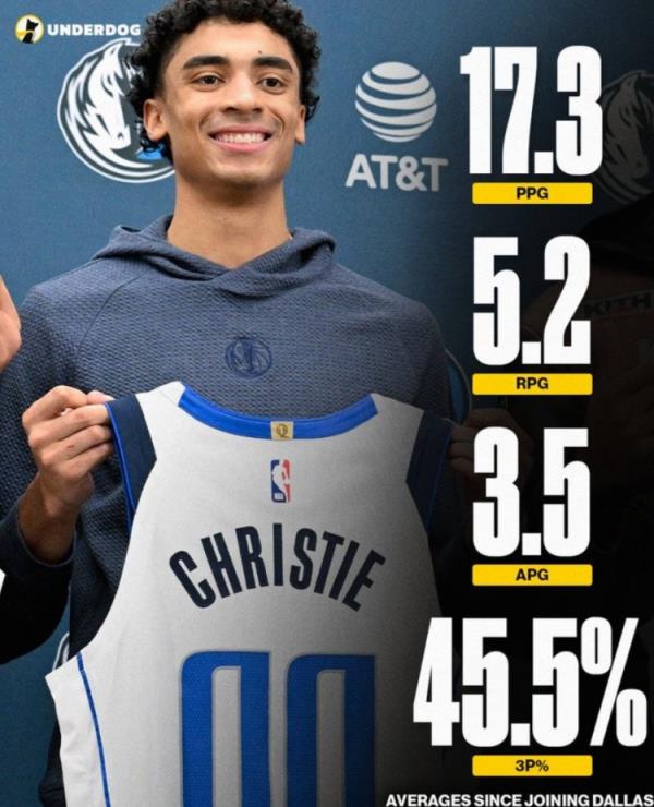 在加盟独行侠后,克里斯蒂场均场均拿下17.3分5.2篮板3.5助攻,三分命中率45.5%。