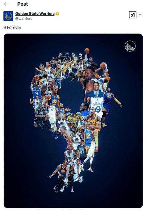 赛前,勇士官方晒出一张由一哥头像组成的数字9图片,配文写道:“永远的9号”。