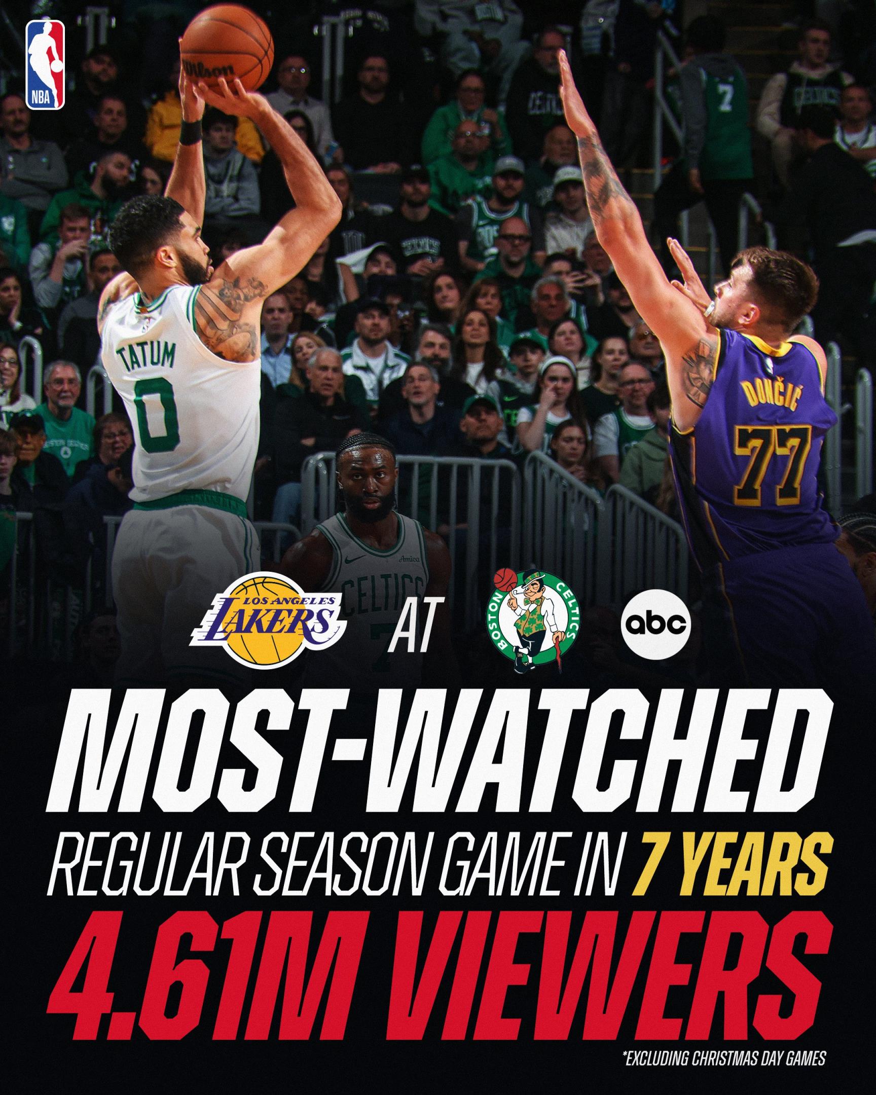 在NBA周六黄金时段的比赛中,湖人对阵凯尔特人的比赛平均吸引了461万观众,在ABC电视台播出。这使得该场比赛成为过去七年来(不包括圣诞节)收视率最高的常规赛,并且比同期时段的收视率提高了92%。