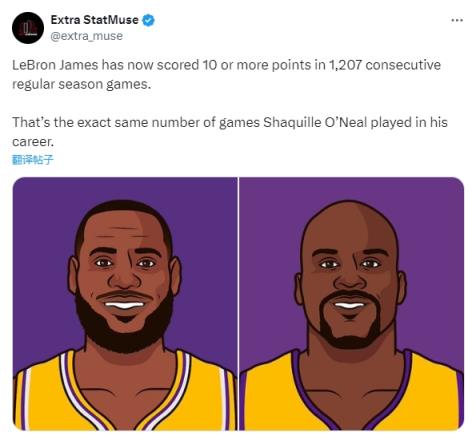 詹姆斯连续1207场常规赛得分上双(历史第一且大幅领跑),和“大鲨鱼”奥尼尔NBA生涯常规赛出场数(1207场)持平。