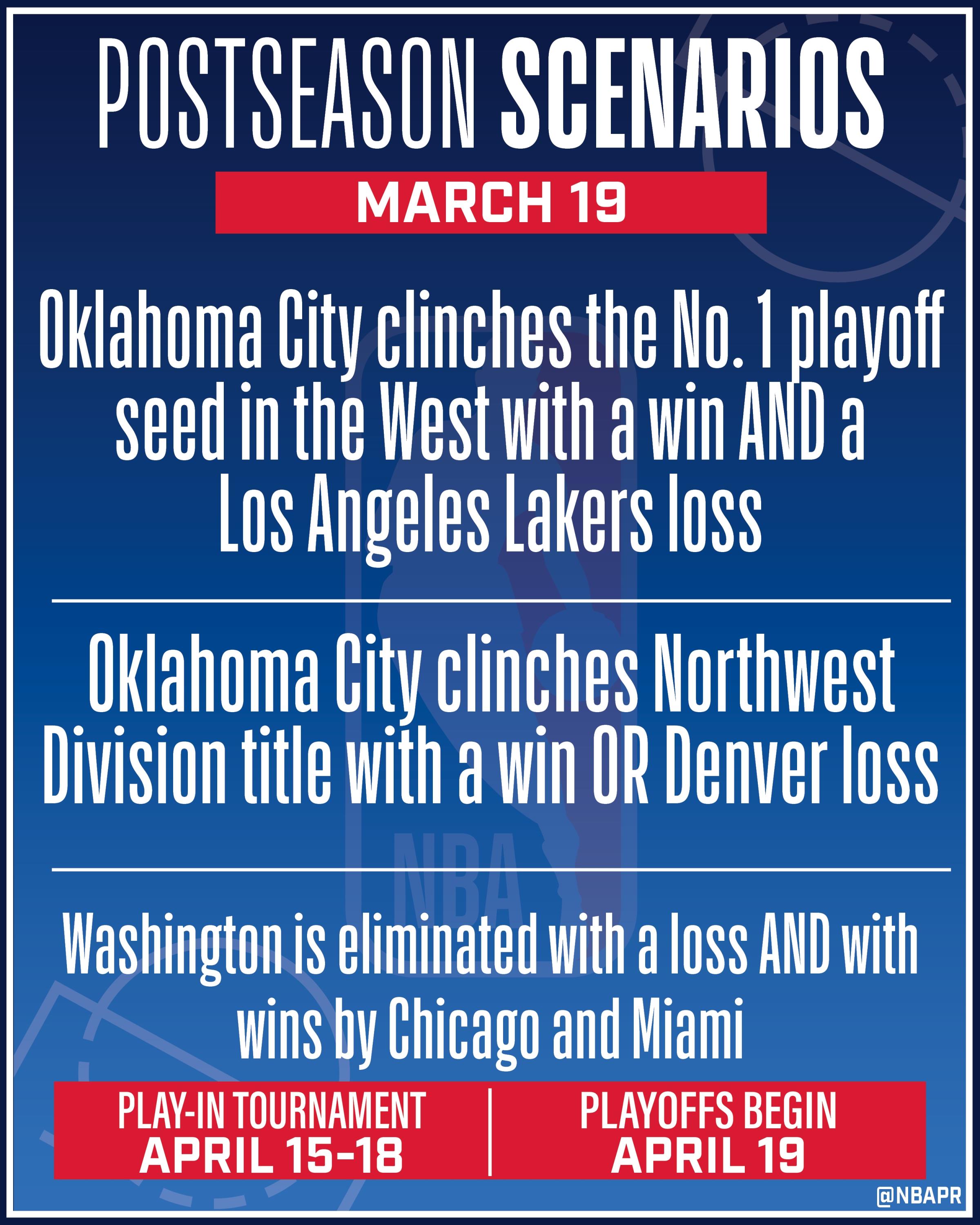 若雷霆赢球+湖人输球(对阵掘金),雷霆锁定西部季后赛1号种子(即西部第一);