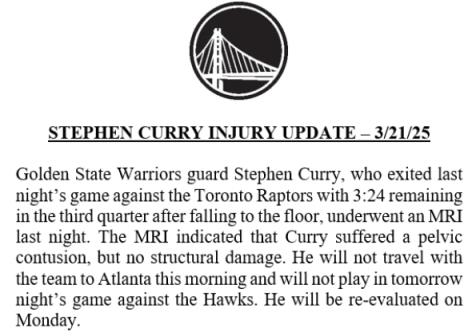 03月22日讯 勇士官方宣布,库里接受了核磁共振检查,确认骨盆存在挫伤,但没有结构性损伤。