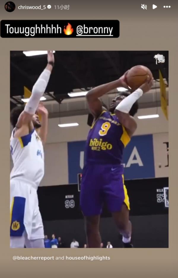 比赛中,布朗尼帅气变向后面对贴防打进高难度后仰跳投,前队友伍德转发道:“太难了@布朗尼。”