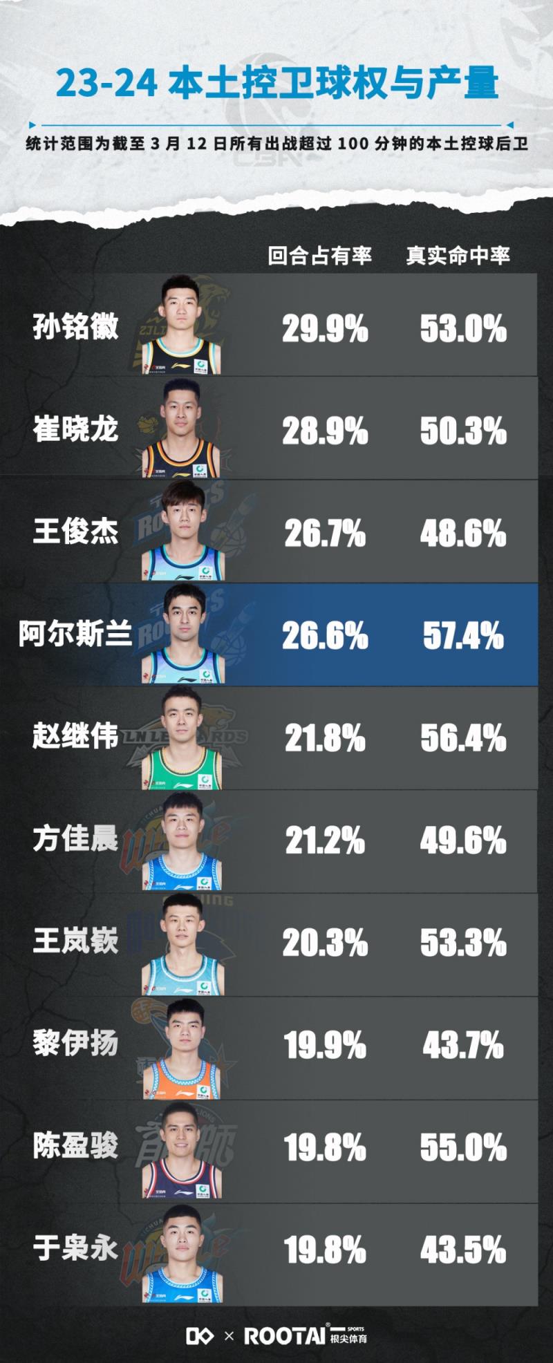 3月13日讯 据中国篮协技战术服务平台“普罗篮球”统计,宁波队后卫阿尔斯兰赛季至今真实命中率57.4%,该数据领跑回合占有率前十本土控卫。