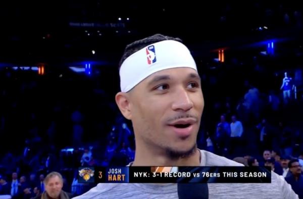 3月13日讯 今日NBA常规赛,尼克斯以106-79战胜76人。赛后,尼克斯队后卫约什-哈特接受记者采访。