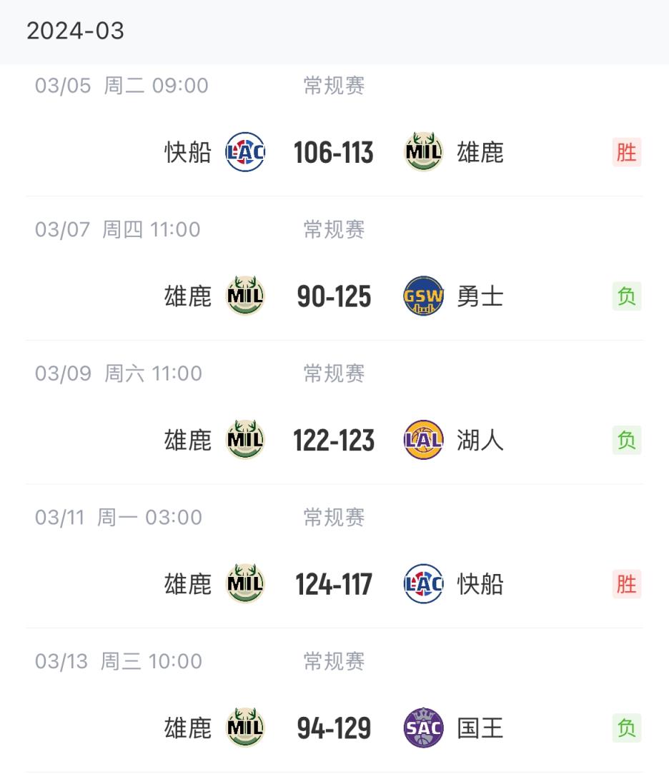 这样,雄鹿加州四连客以1胜3负结尾,输给了勇士、湖人和国王,只赢了快船。
