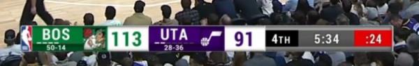 3月13日讯 NBA常规赛,凯尔特人和爵士第四节的比赛正在进行中。