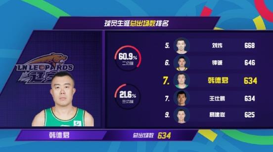 根据数据统计,此役之后,韩德君总出场数达到634场,在CBA联赛球员生涯总出场数和王仕鹏并列第七位。