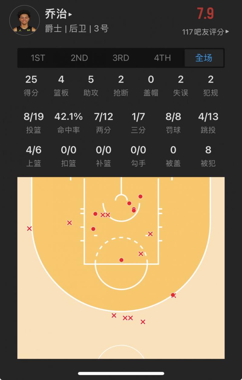 爵士16号秀 基昂特-乔治 出战34.5分钟