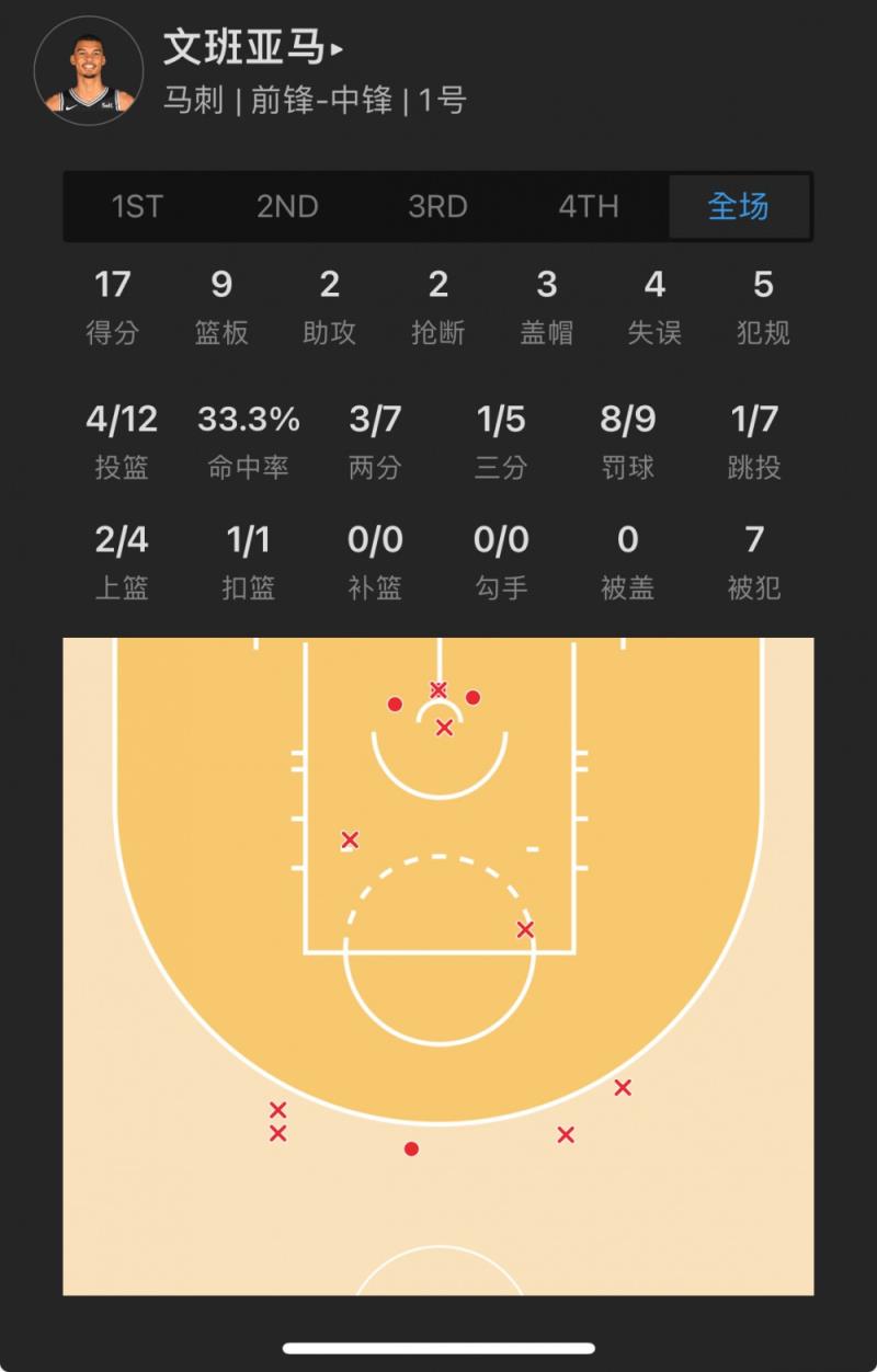 马刺状元秀 维克托-文班亚马 出战33.2分钟