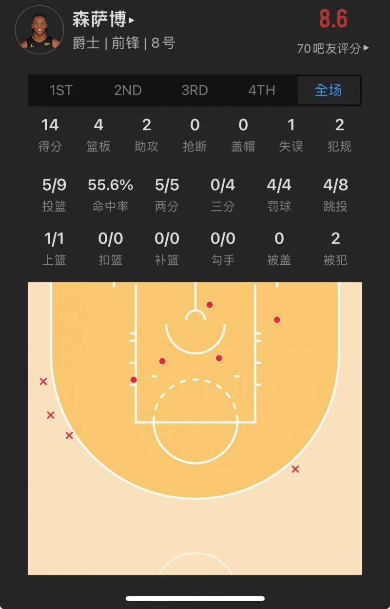 爵士28号秀 布莱斯-森萨博 出战28.3分钟
