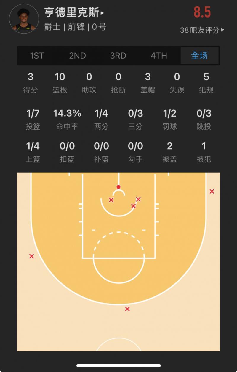 爵士9号秀 泰勒-亨德里克斯 出战19.4分钟