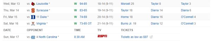 北卡州立大学在ACC锦标赛中势如破竹,他们4天内取得4连胜闯进冠军赛。这是史上第二次有两位数种子队进入ACC锦标赛冠军赛,上一次是2007年。值得一提的是,那次冠军赛也是10号种子北卡州立大学对阵1号种子北卡大学,北卡州立最终80-89不敌北卡大学。