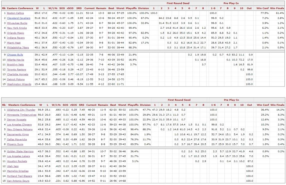 根据BBR模型模拟预测,凯尔特人夺冠概率61.4%高居榜首,雷霆14.2%排在第二,森林狼8.3%排在第三。
