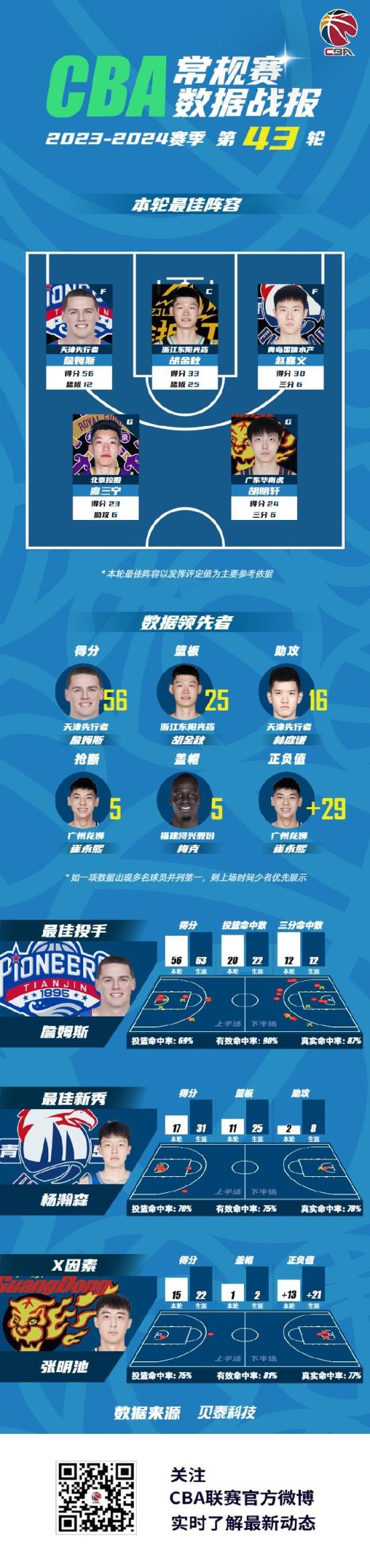 2023-2024赛季CBA联赛常规赛第43轮结束较量,来自天津荣钢篮球俱乐部的詹姆斯、浙江广厦篮球俱乐部的胡金秋 、青岛国信海天篮球俱乐部的赵嘉义、北京控股篮球俱乐部的廖三宁和广东宏远篮球俱乐部的胡明轩入选CBA联赛常规赛第43轮最佳阵容!