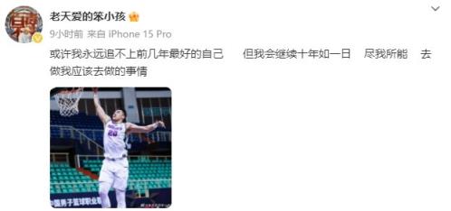 赛后,山东男篮中锋陶汉林更新了个人微博。陶汉林晒出自己的比赛照,并写道:“或许我永远追不上前几年最好的自己,但我会继续十年如一日,尽我所能,去做我应该去做的事情。”
