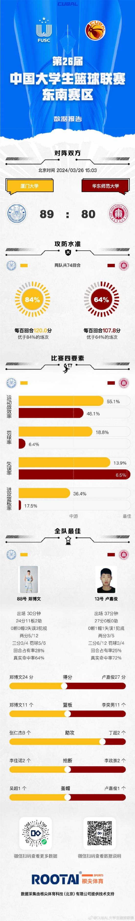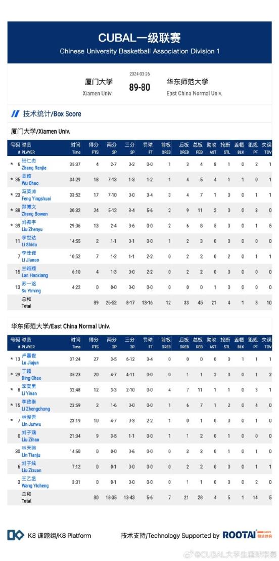 3月26日讯 CUBAL一级联赛,厦门大学和华东师大迎来直接交锋。
