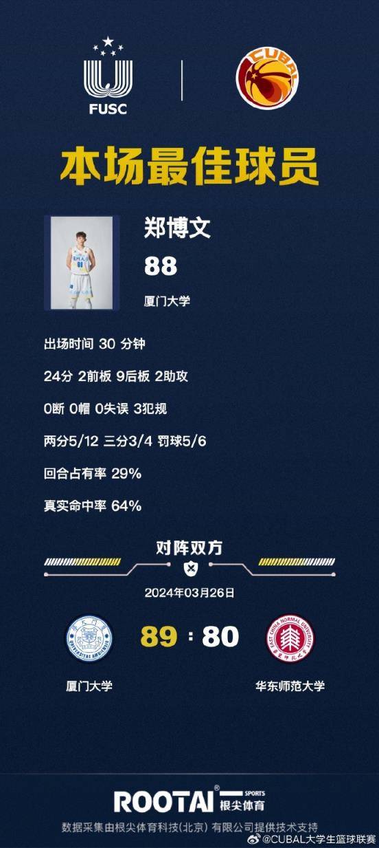 厦门大学:郑博文24分11板,吴超18分5板,冯英帅17分7板,刘振宇13分8板5助