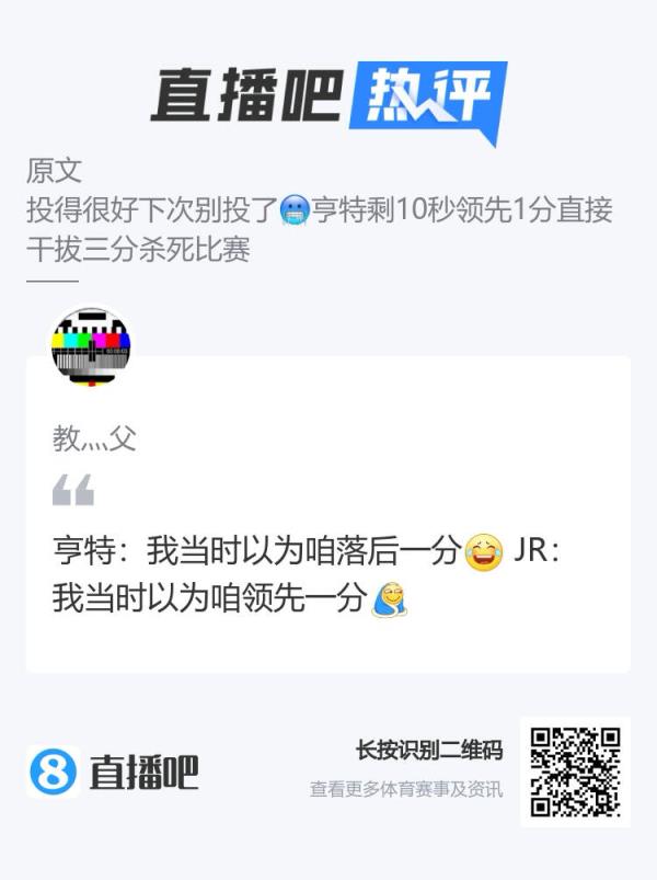 吧友调侃亨特领先拔三分:我以为落后1分 JR:我以为领先1分