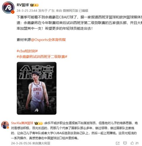 03月26日讯 据微博媒体人RV篮球报道,据一家报道西班牙篮球和欧洲篮球媒体报道,浙江球员余嘉豪将在今年联赛结束后试训西班牙第二级别联赛的五家俱乐部,并且大概率加盟其中一支。