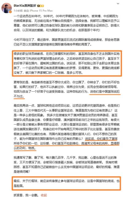 随后“StarXia澳洲篮球”再次更新微博发表相关个人感想,原文如下。