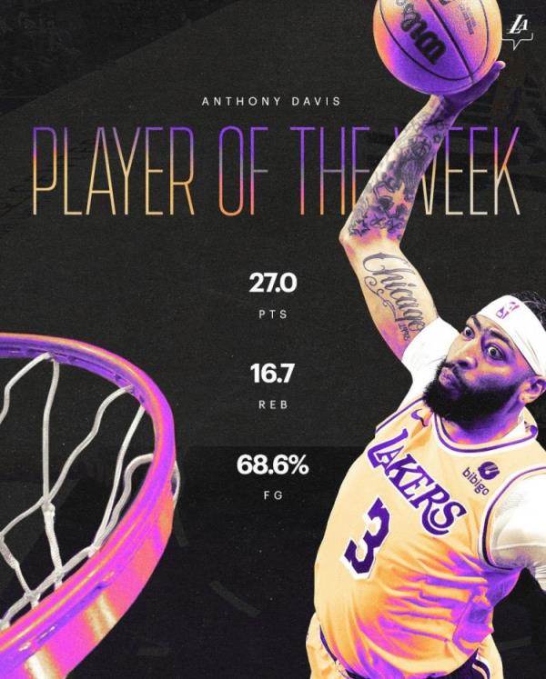 上周浓眉带领湖人取得了3胜0负的战绩,场均可以得到27分16.7篮板,投篮命中率68.6%。