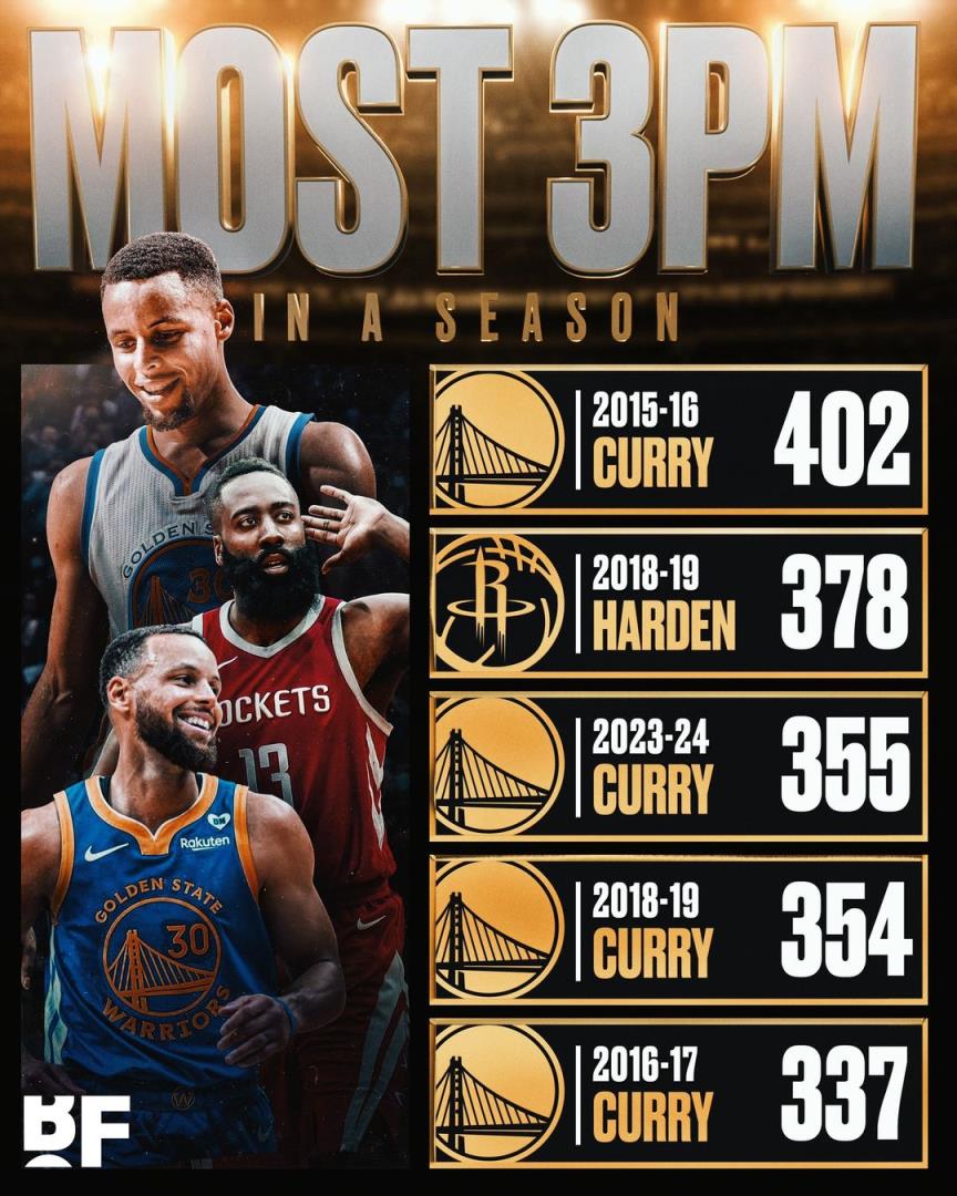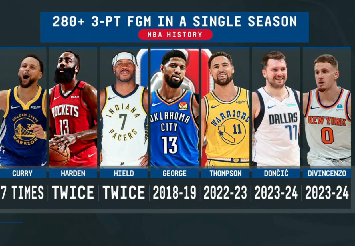 历史单季命中280记三分:库里七次傲视群雄 哈登&希尔德两次并列