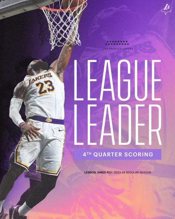 湖人官推晒詹姆斯海报:末节之王——勒布朗本赛季第四节得分领跑全联盟