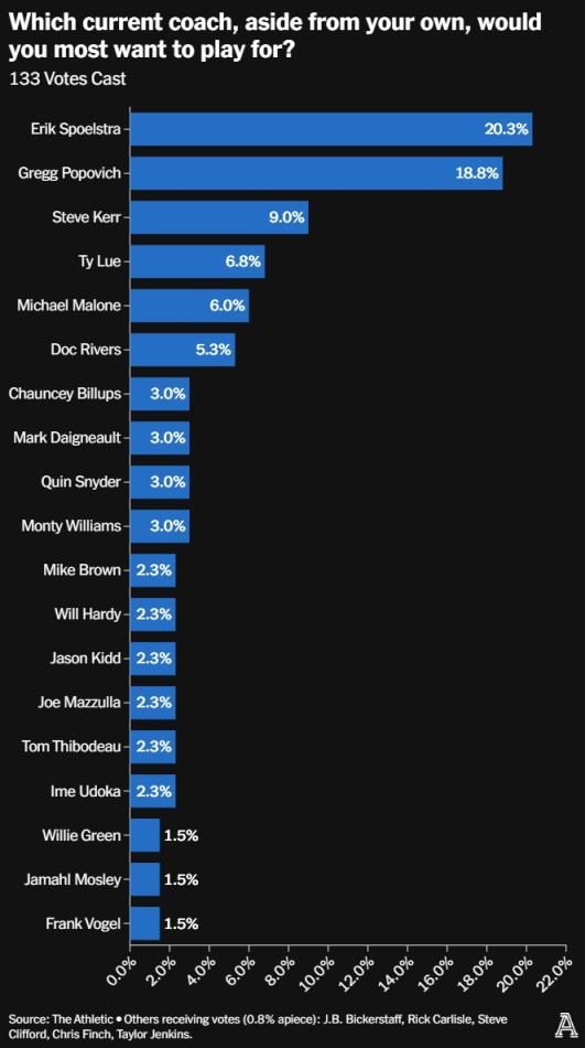 在关于最想效力的主帅(除了自己的主帅)投票中,有133人进行了参与。最终斯波尔斯特拉以20.3%的得票率排在第一,波波维奇以18.8%排在第二,科尔以9.0%排在第三。