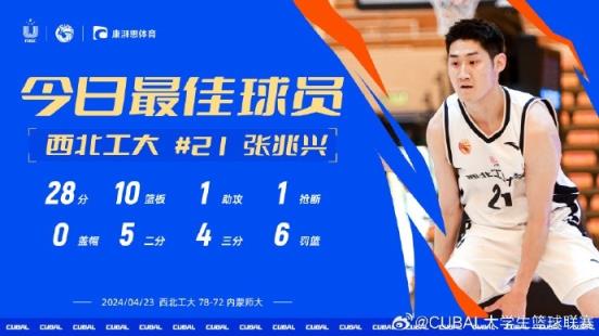 小组赛第五轮MVP给到西北工业大学21号张兆兴,在对战内蒙师大的比赛中拿下28分10篮板的两双数据,更是在关键时刻多次三分命中稳住局势,最终战胜对手,带领球队以全胜战绩小组第一出线。